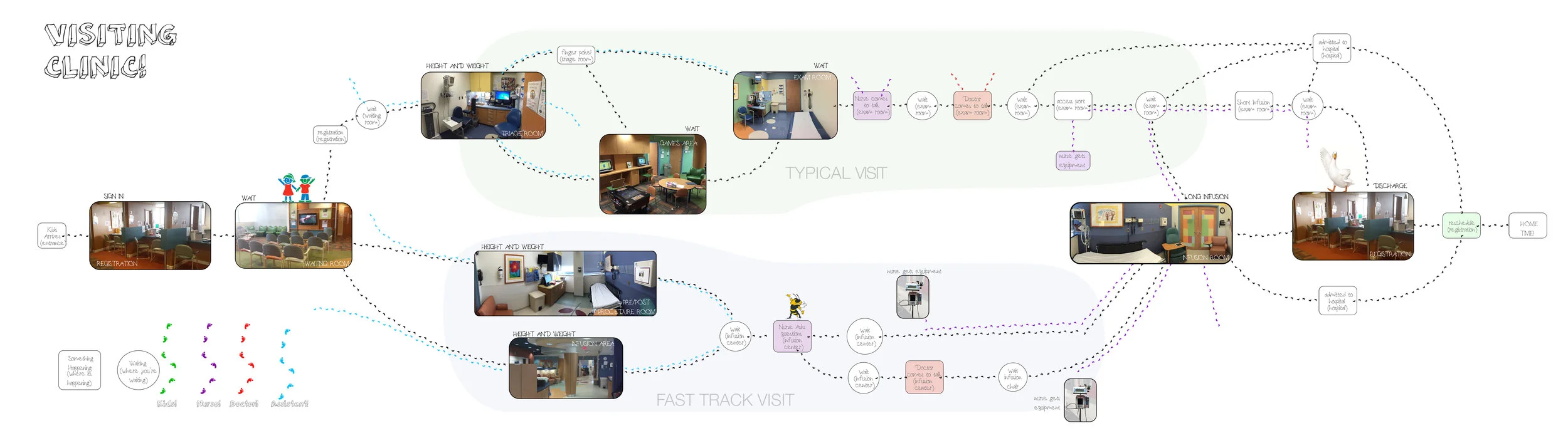 To get a better understand of the clinic and how kids navigate through the space, we conducted some field observations. During the first visit we observed, captured some images of various rooms, walked through the entire clinic process as kids and their parents/guardians would, gained better understanding of the advantages and limitations of the space, and finally met with a few nurses and Dr. Karen Wasilewski, MD. Dr. Wasilewski also served as our primary source for client contact.